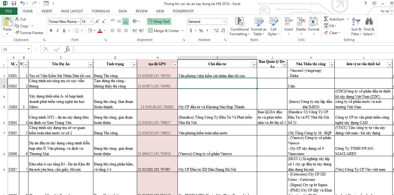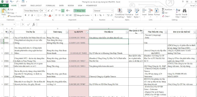 Bước 1: tạo 1 file excel với nhiều cột, mỗi cột là 1 thông tin bạn cần thông tin thêm vị trí mình sẽ lưu đó,nhưng quan trọng nhất là cột tọa độ GPS có lưu tọa độ GPS mình có từ trước như hình 1