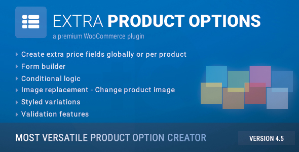 WooCommerce Extra Product Options Extension. Create priced product variations, conditional logic (within the form builder), build forms, style & validate features. 5 star support.